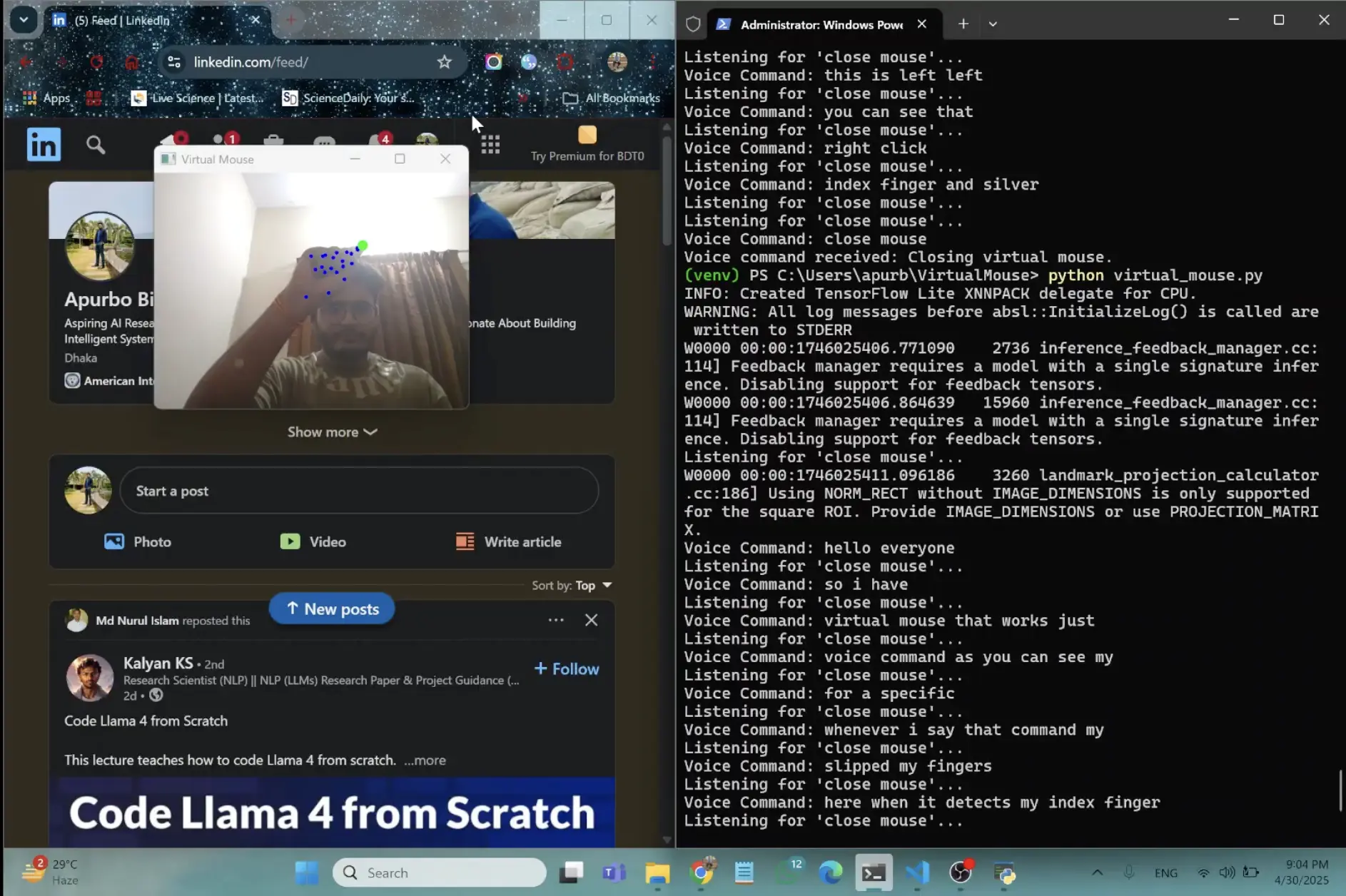 A real-time computer vision system enabling gesture-based mouse control using MediaPipe and OpenCV. Hand landmarks are mapped directly to cursor movements with smoothing and low-latency interaction.